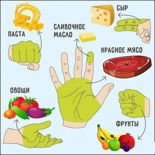 3. Открытая ладонь без учета пальцев показывает, какой кусок мяса нужно съедать в день.