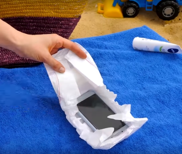 Хорошее место для хранения денег в отеле или на пляже — это, конечно же, детский подгузник. Он довольно вместительный и без труда закрывается в компактный тайник с помощью липучек. В подгузник можно сложить смартфон, украшения, деньги, банковскую карточку, ключи от машины, да все что угодно. Надо уложить вещи компактно, а потом завернуть детское средство гигиены и заклеить липучками, чтобы ничего не выглядывало. Для пущей наглядности на пляже можно положить сверху кусочек шоколада, который растает на солнце и будет отпугивать всех любопытных.