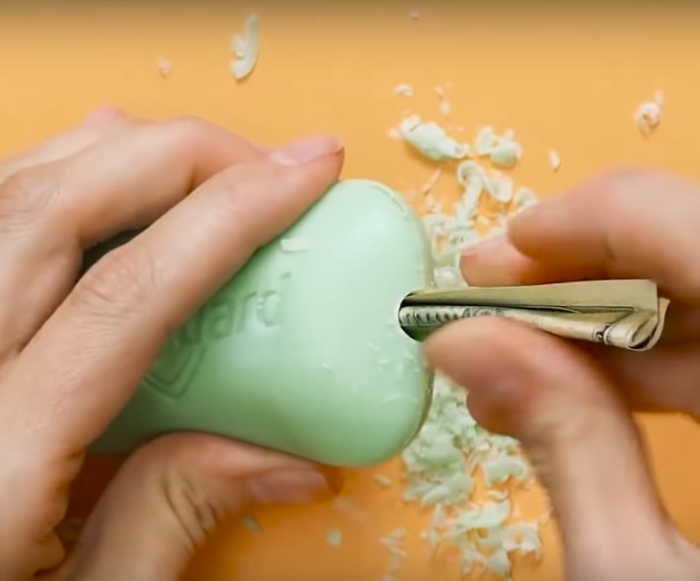 Перед поездкой всегда возникает резонный вопрос, а куда лучше положить деньги так, чтобы их не украли. Вот один из современных приемов — положить в мыло. Для этого просто понадобится сбоку мыла, в его самой неприметной части, сделать отверстие с помощью дрели на малых оборотах. Теперь крупные купюры можно свернуть трубочкой и положить внутрь, а отверстие заклеить мыльной стружкой.