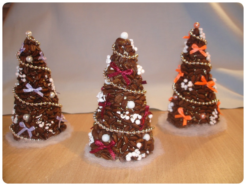 Вкусные и ароматные елочки делают из конфет и всяких сладостей, из клубники, соцветий капусты брокколи, из макарон, из кофе.