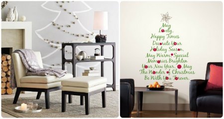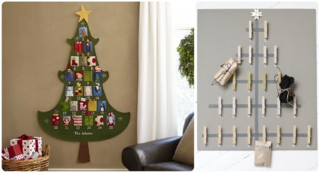 Прямо на стене выкладываем из красивой зеленой тесемки наше новогоднее деревце и фиксируем. А на его веточках развешиваем и закрепляем мешочки с подарками. Или же делаем контуры елки из проволоки, закрепляем на стене и украшаем ее елочными шарами разных оттенков и разного размера.