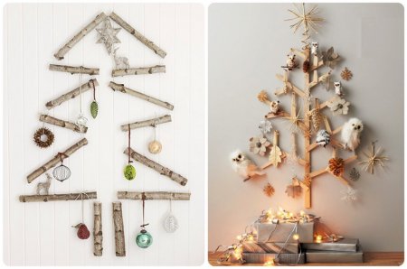 Простейший вариант имитации присутствия елки в помещении: на проволочный каркас, который устанавливают в любую вазу, но желательно с узким горлом (можно зафиксировать его в куске пенопласта, декорированного тканью или перьями), прикрепляются ветви сосны или ели. Украсить их можно искусственным снегом, шарами и бантами.