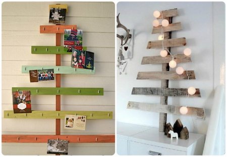 Елка из транспортного деревянного поддона – весьма оригинальная идея. Но потребует в исполнении некоторого умения и специальных навыков: лобзиком вырезать треугольник нужного размера, покрасить в разные оттенки зеленого, прикрепить к стене и украсить игрушками, гирляндой и мини-подарками.