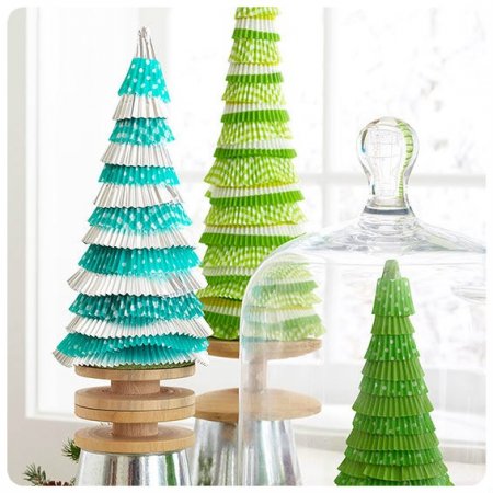 Еще одна идея, как сделать красочную новогоднюю елку – использовать для ее изготовления формочки для выпечки из фольги разного цвета. На конус, начиная от нижней его части, нанизываются формочки (с заранее вырезанными отверстиями в донышке), частично перекрывая друг друга до макушки.
