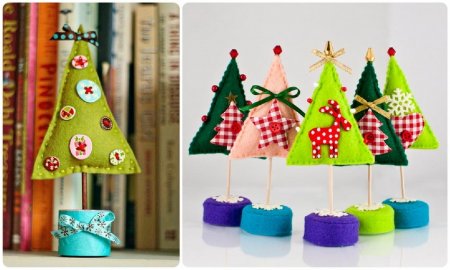 Симпатичные елочки-сувениры получаются из остатков ткани, из кусочков фетра, из разноцветной бумаги, из бисера, сваленные из шерсти, связанные из остатков ниток.