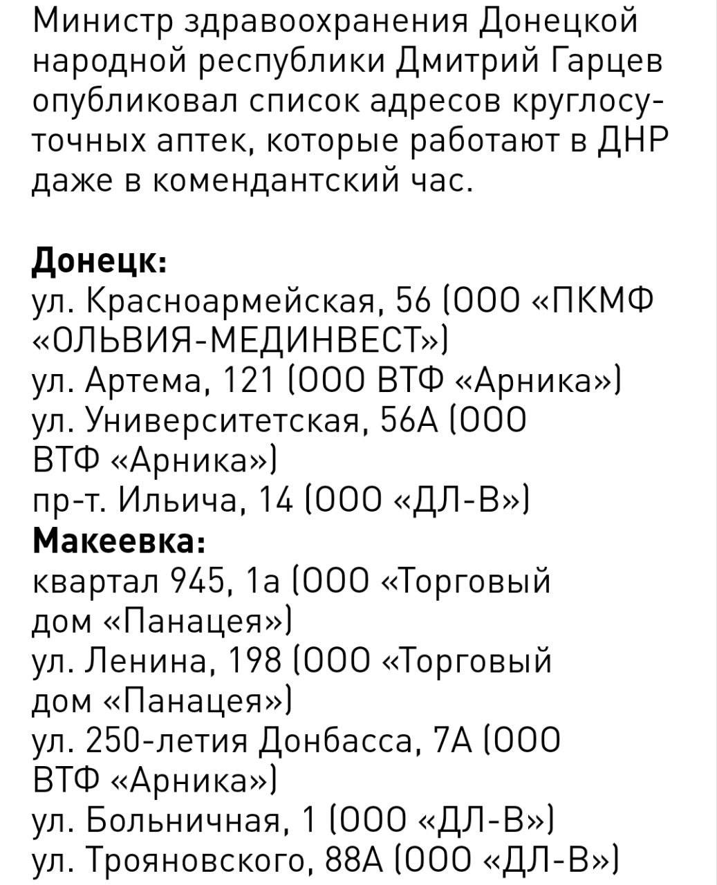 Министр здравоохранения ДНР, Дмитрий Гарцев, опубликовал список аптек, которые работают круглосуточно, даже во время комендантского часа.