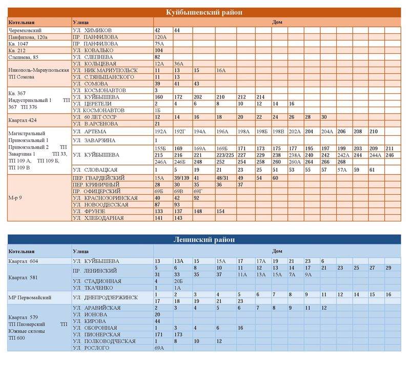 - Ленинский район: ул. Аравийская, ул. Днепродзержинская, пос. Красный Пахарь, пр. Ленинский 7а-37, пр. Ленинский 6-14, пер. Гражданский, Куйбышева 1-58, пос. Ларинка, пос. Нестеровка, пос. Закоп, мкрн. Южные склоны, ул. Воровского, ул. Широкая, ул. Луговцова, ул. Стенделя, ул. Коллективная, ул. Саратовская, ул. Муравьева, ул. Снегиревская, ул. Чикирисова, ул. Авиационная, ул. Стадионная, ул. Олега Кошевого, ул. Оборонная, ул. Куйбышева, 41-55, ул. Кирова, 1-56, пос. Александровка (1-10).