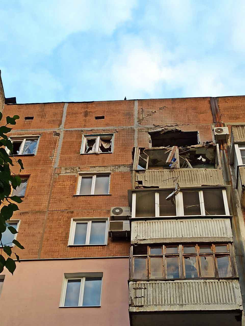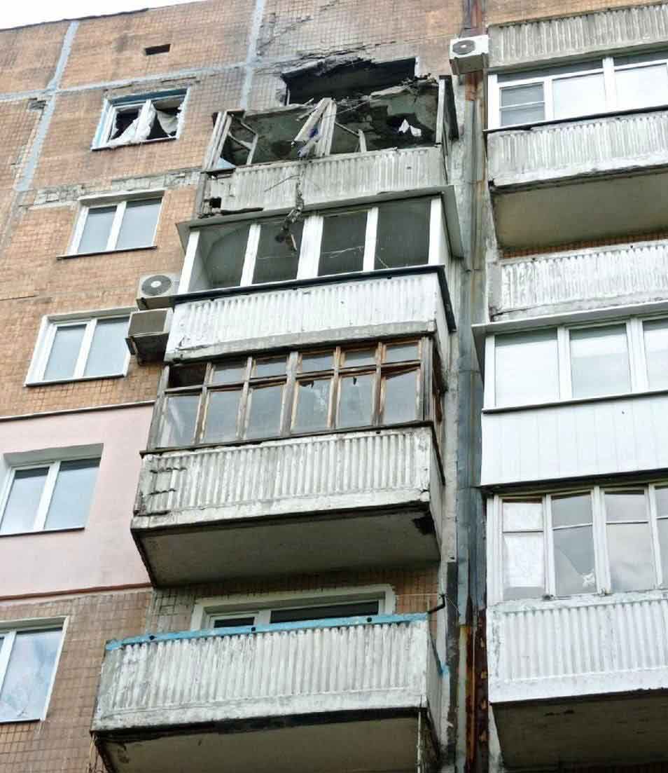 - ул. Степана Щипачева, 2 - попадание в квартиру, 9 этаж 1 подъезд; разрушен балкон, частично повреждено остекление верхних этажей.