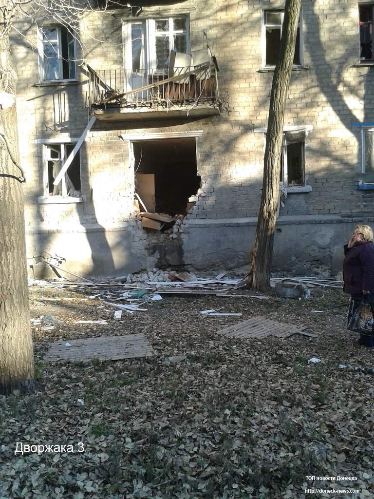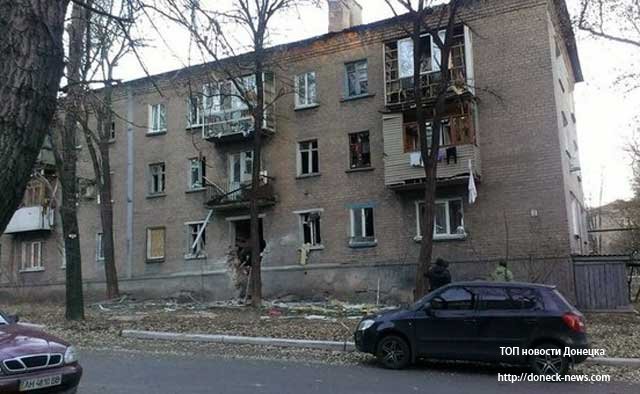По причине попадания снаряда в квартире на третьем этаже девятиэтажного дома уничтожены два оконных и два дверных блока, часть межкомнатной перегородки, мебель, вещи хозяев. Дом расположен в Киевском районе.