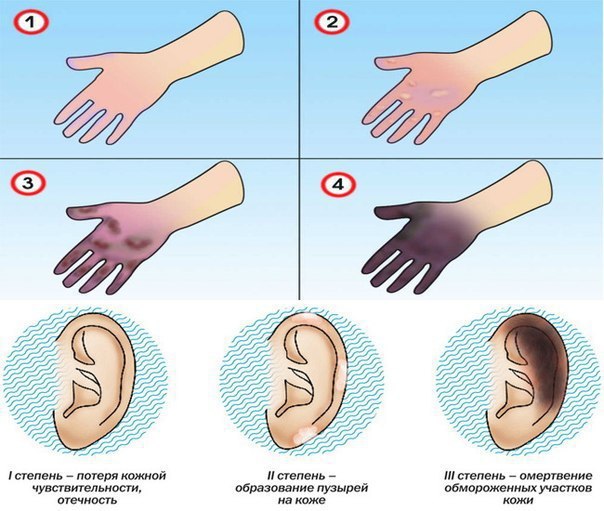 Первые признаки обморожения - появление бледных пятен на коже, с усиливающимся покалыванием. Чаще всего наблюдается обморожение рук, пальцев ног, а также открытых частей головы: носа, щёк, ушей. Коварство случившегося заключается еще и в том, что при дальнейшем пребывании на холоде, человек перестает испытывать болезненные ощущения, и ситуация может стать угрожающей. Кожа становится холодной, плотной на ощупь. Наступает онемение и потеря чувствительности.