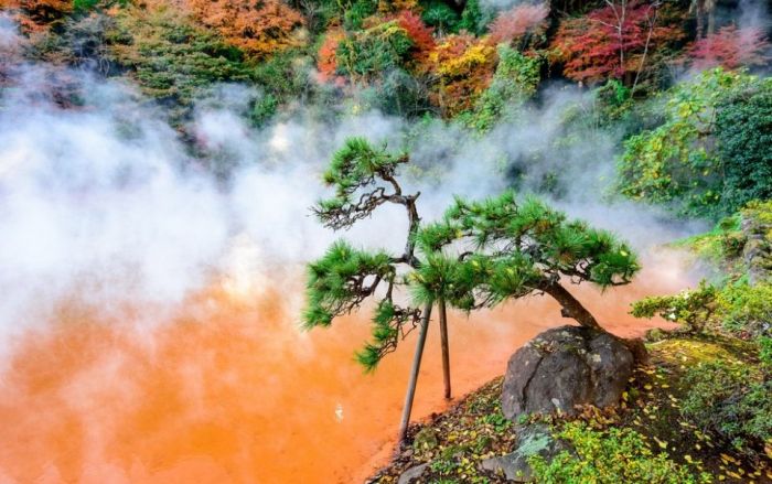 Захватывающее естественное чудо природы вдохновляет японских и международных туристов из года в год посещать эту область. Красный цвет воды обеспечивается высоким уровнем железа в воде. В комбинации с горячим паром эффект красной воды действительно захватывает дух. Область упоминается японцами как пекло из-за необычных пейзажей и кипящей воды. У горячих источников Японии есть многочисленные целебные свойства, включая омолаживающий. Приняв ванну в источниках Беппу Вы получите массу удовольствия. Источники Беппу входят в список самых необычных мест на Земле.